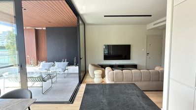 The apartment features a bright and spacious living area, filled with natural light thanks to its south-facing orientation. There are two large bedrooms, both tastefully decorated and designed for relaxation. The master bedroom has a private en-suite bathroom, while the second bathroom is conveniently located for guests or family members.